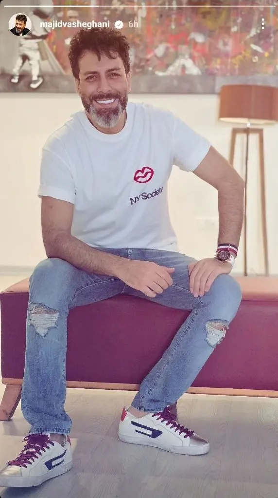 طراحی داخلی و دکوراسیون این فضا بر پایه سادگی و هنر مدرن استوار است. دیوار پشت مجید واشقانی با یک نقاشی بزرگ و رنگهای گرم و زنده تزئین شده است که انرژی و هیجان خاصی به محیط میبخشد. استفاده از چنین تابلویی در کنار عناصر دیگر با رنگهای خنثی مانند کفپوش و مبلمان، کنتراستی جذاب ایجاد میکند. کف فضا از چوب روشن ساخته شده است که حس گرما و دلنشینی را منتقل میکند و در عین حال به روشنایی فضا کمک میکند. نیمکتی که فرد روی آن نشسته، طراحی ساده و مینیمالیستی دارد و رنگ آن با اثر هنری هماهنگ است، که تأکید بر رویکرد مدرن در طراحی داخلی است.