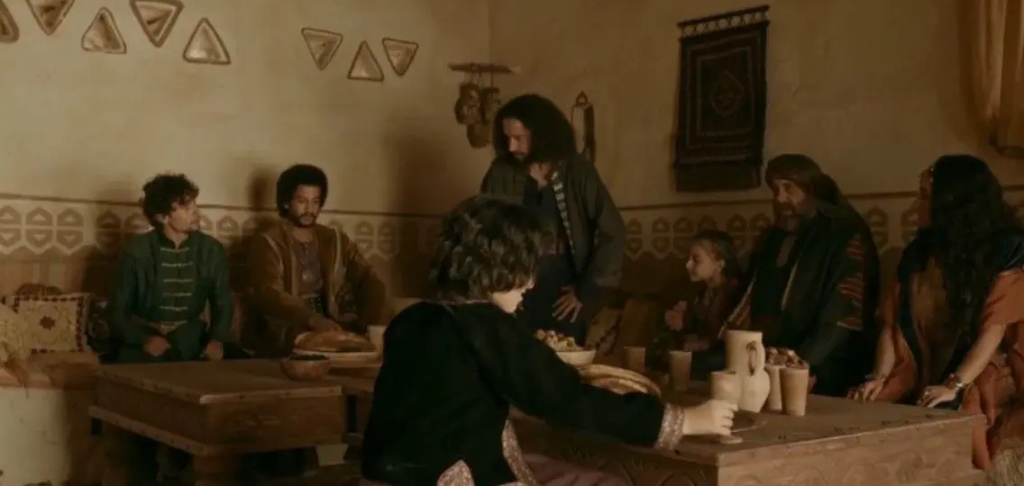 در چیدمان، افراد دور میز چوبی سادهای جمع شدهاند و غذاهای محلی و متناسب با فرهنگ آن زمان بر سر سفره است، که حس زندگی روزمره را به واقعیت نزدیکتر میکند.
