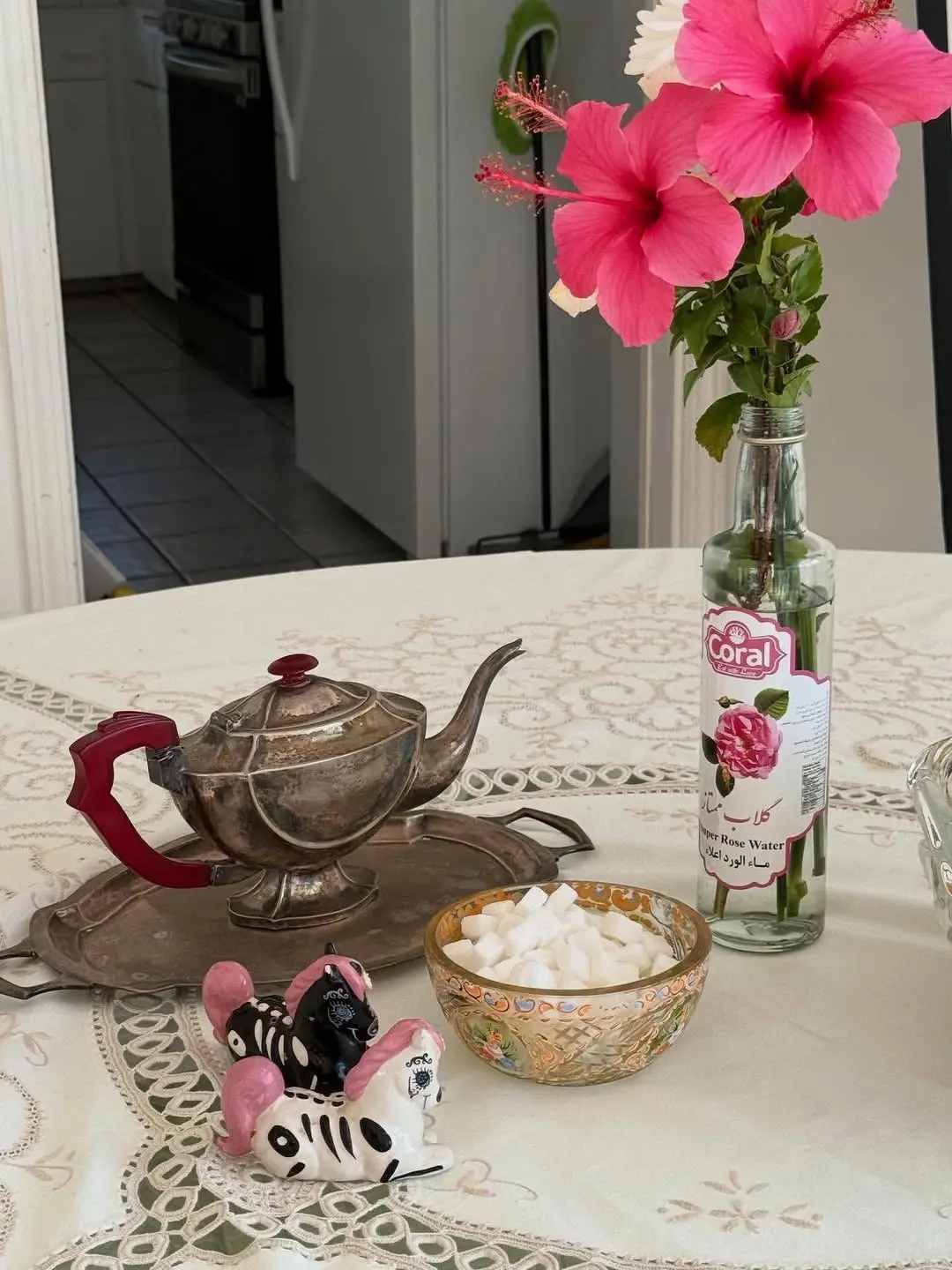 در این تصویر، یک فرش ایرانی زیبا با طرحی اصیل، نقش مهمی در دکوراسیون خانه ایفا میکند و فضایی دلنشین و سنتی را ایجاد کرده است. جزئیات موجود در خانه نشانگر فرهنگ غنی ایرانی است؛ از قوری سنتی قرار گرفته بر روی میز گرفته تا شیشههای عطرآگین گلاب، بستههای تافی مینو که یادآور خاطرات کودکی هستند، تخته نرد به عنوان نماد بازیهای سنتی و حتی یک روزنامه قدیمی ایرانی که حس تاریخ و فرهنگ را به تصویر میکشد.
