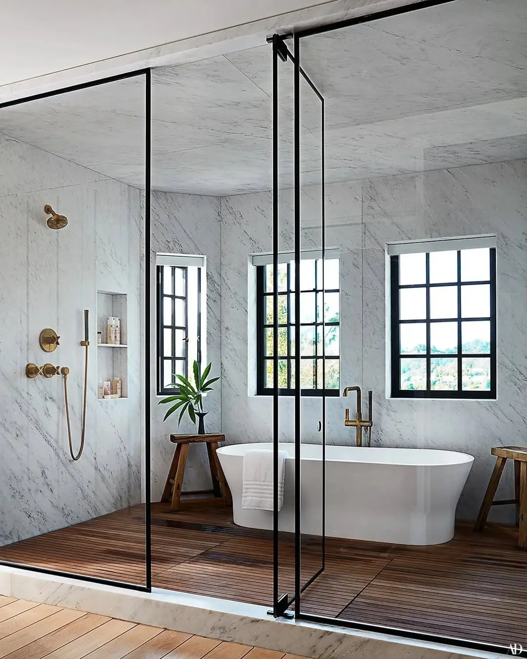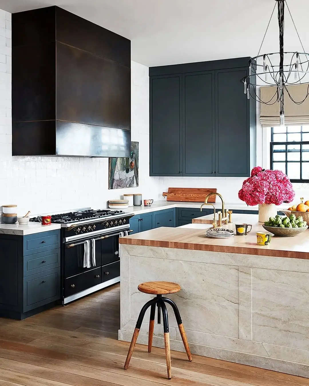 آشپزخانه و سرویس بهداشتی این منزل نیز شهرت زیادی دارند؛ از کابینتهای با رنگ تیره گرفته تا وان معلق در حمام و دوشهای با رنگ طلایی، همگی به فضای داخلی ظاهری مدرن و ساده بخشیدهاند.