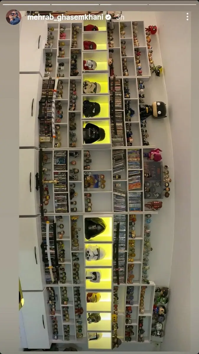 دکور لوکس و منحصر به فرد آقای قاسمخانی، گالری خصوصی پر از کلکسیونهای نادر سینمایی و شخصیتهای محبوب با نورپردازی خاص و چیدمان منظم