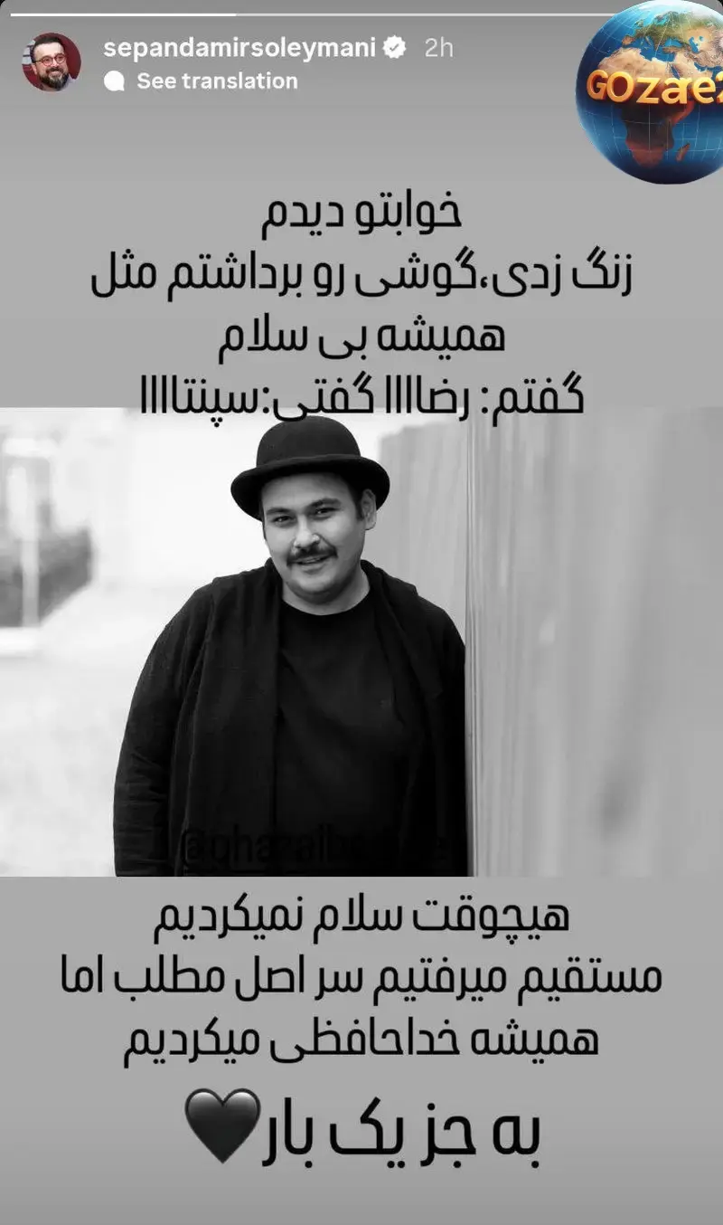 سپند امیرسلیمانی، بازیگر سینما و تلویزیون، با انتشار یک استوری در شبکههای اجتماعی، یاد و خاطره زندهیاد رضا داودنژاد را گرامی داشت. این اقدام با واکنشهای احساسی از سوی کاربران و هنرمندان مواجه شد و بسیاری از مخاطبان با ابراز همدردی، این حرکت را بهعنوان نوعی احترام و بزرگداشت برای این هنرمند فقید تلقی کردند.