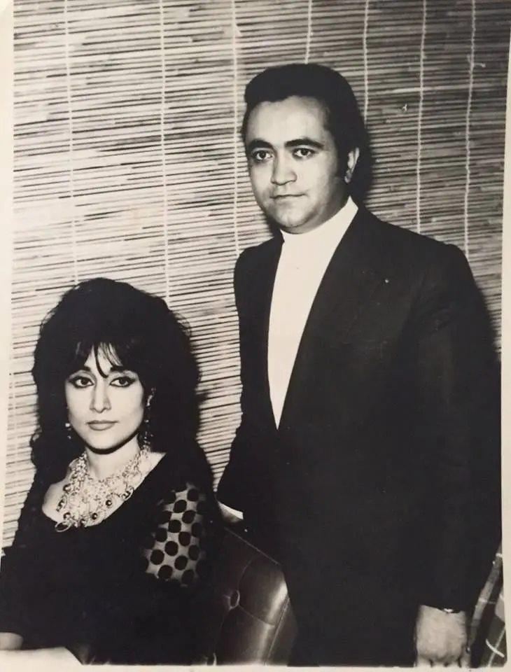 در ادامه، تصویری جذاب از خانم حمیرا را مشاهده میکنید که در کنار همسرش قرار دارد. در پسزمینه، پرده حصیری زیبایی به چشم میخورد که جلوهای خاص به تصویر بخشیده است.