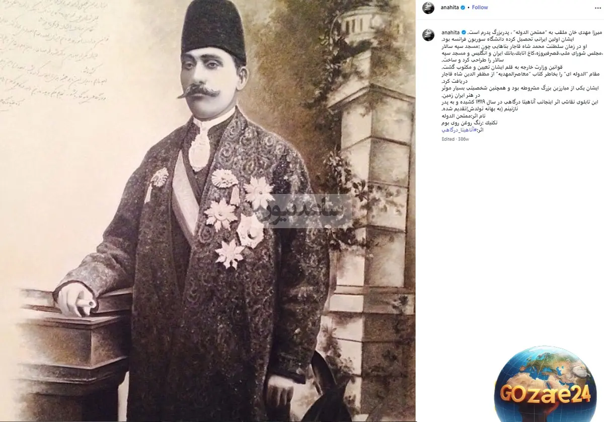 آناهیتا درگاهی، بازیگر و تهیهکننده ایرانی، ریشه خانوادگی مبارز مشروطه «ممتحن الدوله» را دارد؛ تصویری از پدربزرگ پدریاش در اینستاگرام منتشر کرد.
