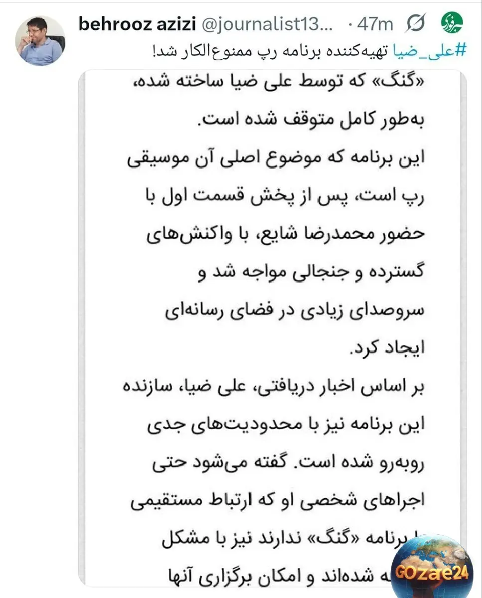 ممنوعالکار شدن علی ضیا به خاطر برنامه جنجالی «گنگ» و محوریت موسیقی رپ
