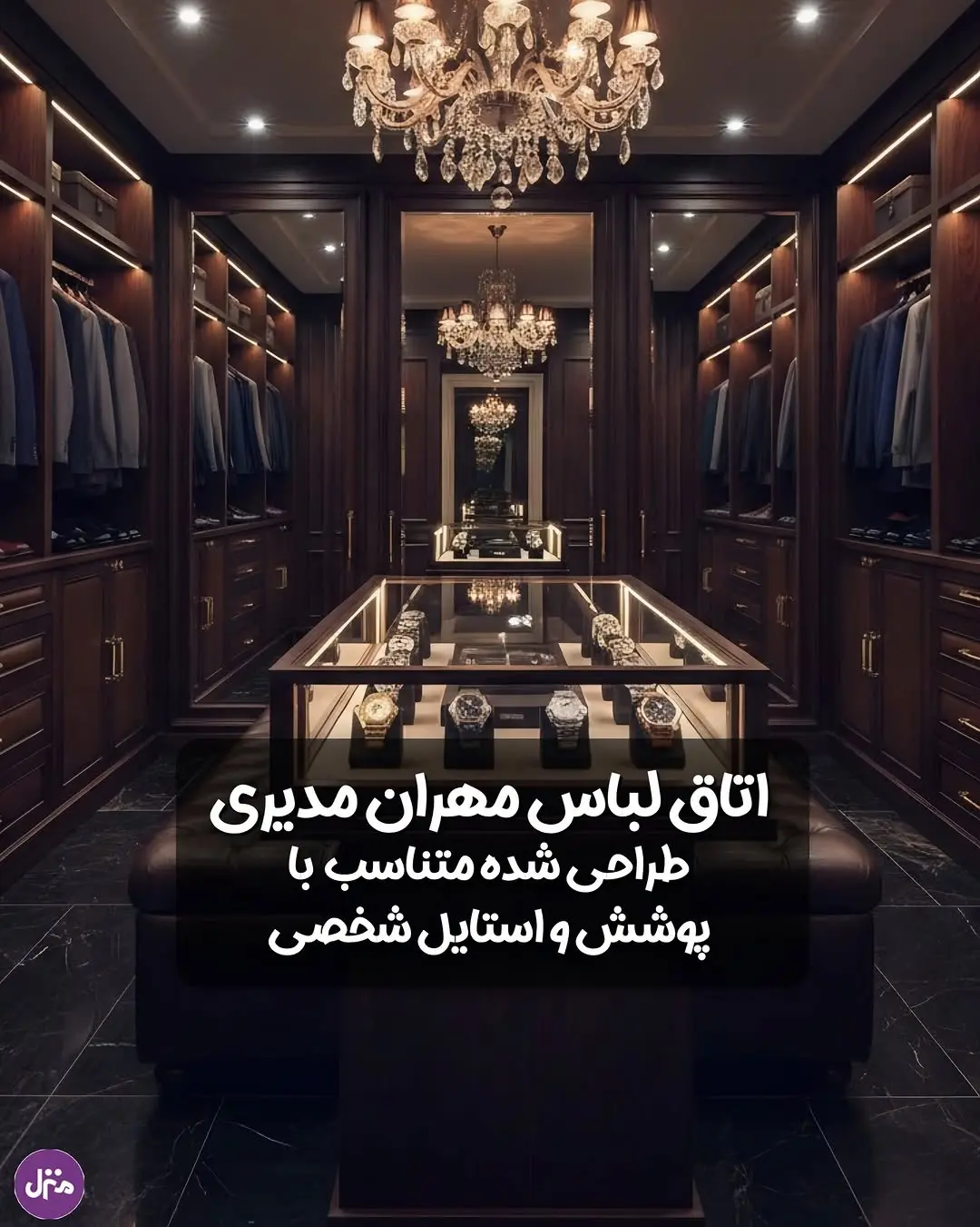 اتاق لباس: طراحی شده بر اساس استایلهای رسمی و سلیقه شخصی ایشان، همراه با مجموعهای از ساعتهای لوکس و منحصر به فرد آقای مدیری.