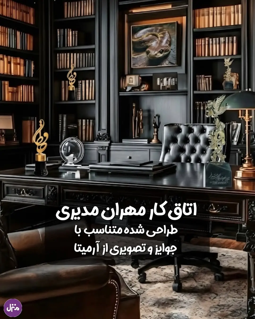 اتاق کار، فضایی تاریک و دلنشین است که با قاب بزرگ تصویر آرمیتا (حیوان خانگی شما) و جامهای افتخار تزئین شده است. این دکوراسیون برای ایجاد تمرکز عمیق، حس آرامش و الهامبخشی طراحی شده است.