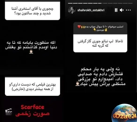 شاهرخ استخری فعالیت حرفهای خود را با بازی در تلهفیلم «تلخون» آغاز کرد و پس از آن در سریالهایی مانند «دلنوازان» و «فاصلهها» به شهرت و محبوبیت قابل توجهی در میان مخاطبان دست یافت. در حال حاضر، این بازیگر کمکارتر از قبل است و با دقت بیشتری پیشنهادهای خود را بررسی میکند تا در نهایت به هدف مورد نظرش برسد. استخری اخیراً در یک چالش مجازی به سوالات طرفدارانش پاسخ داد که بخشی از آن را میتوانید مشاهده کنید.