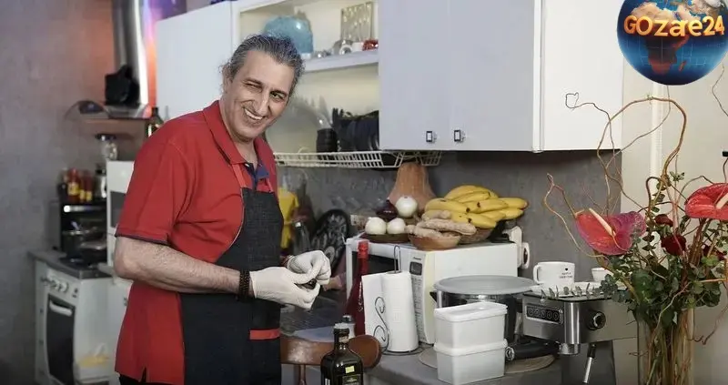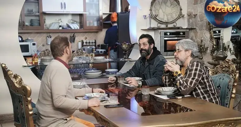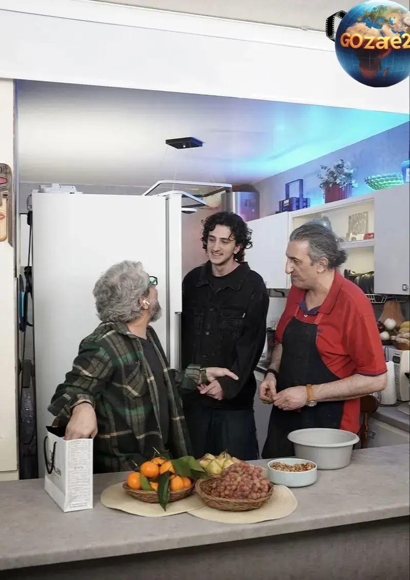 در گوشهای از منزل، میز غذاخوری چوبی با صندلیهای ساده و سنتی قرار دارد که هنرمندان و دوستان صیاد در محیطی دوستانه گرد هم جمع شدهاند. آشپزخانه با طراحی ساده، شامل وسایل عملی و المانهای مدرن مانند قهوهساز و بطریهای روغن زیتون است که ترکیبی از راحتی و کارایی را نشان میدهد. همچنین، استفاده از گلهای طبیعی و گیاهان خانگی به فضا زندگی و سرزندگی بخشیده است.