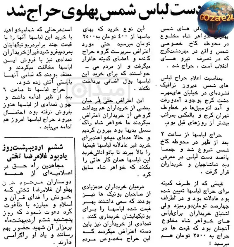 حراج لباس شبهای شمس خواهر شاه در کرج پس از سقوط رژیم ۱۳۵۷ با تصاویر تاریخی و نمادین، نشان دهنده تغییرات فرهنگی و اجتماعی آن زمان است.