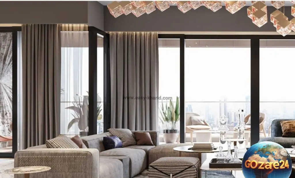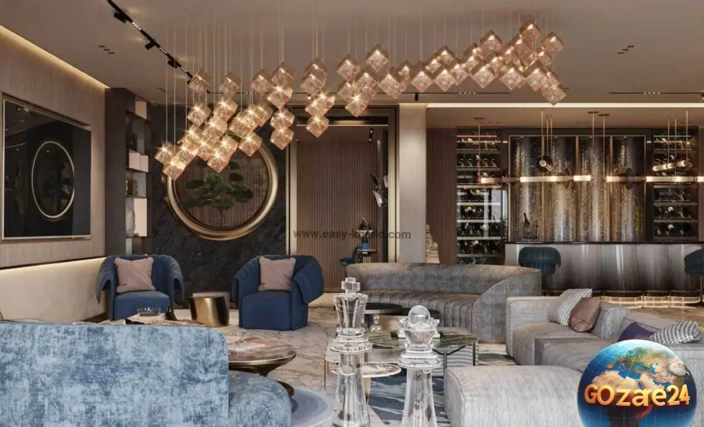 تصاویر طراحی داخلی منزل شهاب حسینی با چیدمان لوکس، رنگ طلایی و لوستر مکعب شیشهای شناور، فضایی مدرن و مجلل با متریالهای باکیفیت و نورپردازی کریستالی را نشان میدهد.