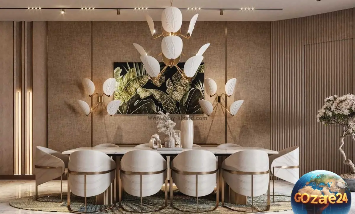 تصاویر لوکس و مدرن خانه شهاب حسینی با چیدمان طلایی و لوستر شیشهای