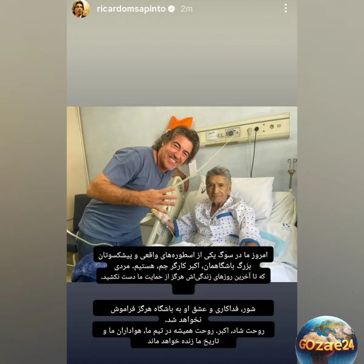 ریکاردو ساپینتو با انتشار استوری در شبکههای اجتماعی، درگذشت اکبر کارگرجم، پیشکسوت باشگاه استقلال، را تسلیت گفت. کارگرجم پس از مدتها مبارزه با بیماری، در عصر روز یکشنبه دار فانی را وداع گفت.