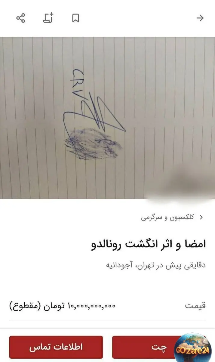 فروش امضای و اثر انگشت کریستیانو رونالدو با قیمت ۱۰ میلیارد تومان در یک سایت، خبر جنجالی و بیسابقه در دنیای ورزش و کلکسیون.