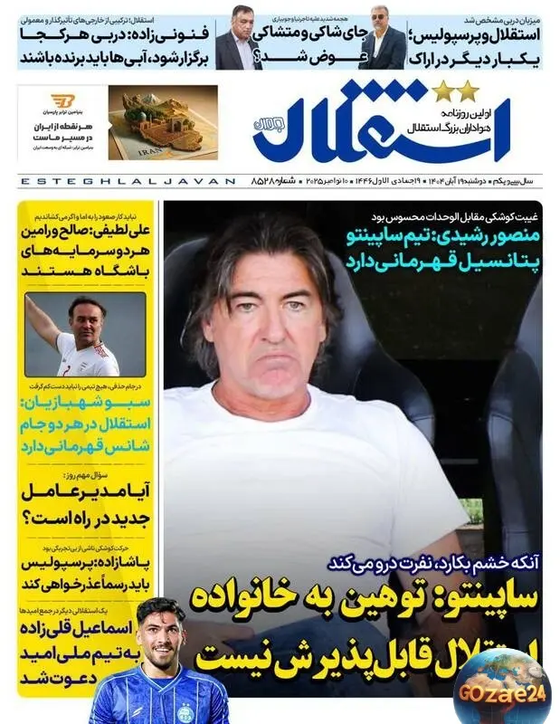 روزنامههای دوشنبه ۱۹ آبان ۱۴۰۴: تحلیلهای ورزشی، سیاسی و اجتماعی، واکنش ساپینتو به توهین به خانواده استقلال، تصاویر و آخرین اخبار روز را در سایت ما ببینید.
