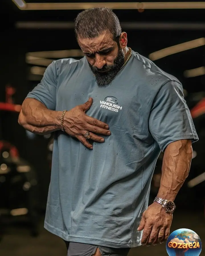 تصویر جذاب از گردنبند و دستبند طلای هادی چوپان نایب قهرمان مستر المپیا با جواهرات درخشان و سنگین، همراه با زندگی و مسیر ورزشی او در فارس و موفقیتهای بینظیر.