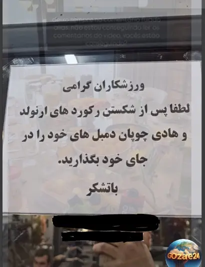 او تابلویی نصب کرد که از ورزشکاران خواسته است «پس از شکستن رکوردهای آرنولد، دمبلها را در جای خود قرار دهند». این عبارت هنرمندانه و پر از کنایه، باعث شد تصویر این تابلو در شبکههای اجتماعی به سرعت منتشر شود و موجی از شوخی و همدلی را برانگیزد؛ چرا که بعید است ایرانی باشید و این را ببینید و نخندید!
