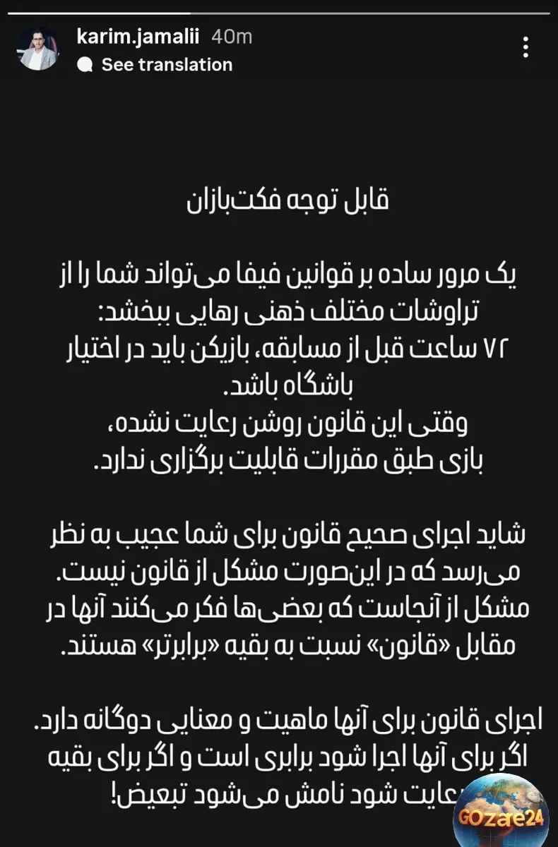 کریم جمالی، مدیررسانهای باشگاه تراکتور، در این باره با عنوان «قابل توجه فکتبازان» نوشت: «یک بررسی ساده قوانین فیفا میتواند شما را از تفکرات مختلف آزاد کند: 72 ساعت قبل از مسابقه، بازیکن باید در اختیار باشگاه باشد. زمانی که این قانون به درستی رعایت نشود، برگزاری مسابقه طبق مقررات امکانپذیر نخواهد بود.»