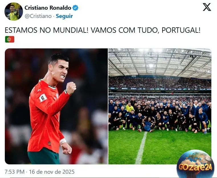 رونالدو با انتشار تصویری از خودش و عکس دیگری از تیمی که امشب در ورزشگاه دراگائو مقابل حریف قرار گرفت، نوشت: «ما در جام جهانی حضور داریم! با نهایت تلاش ادامه میدهیم، پرتغال»