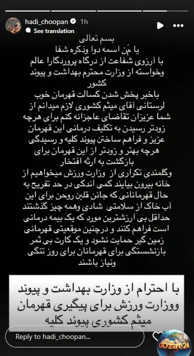 هادی چوپان در استوری عجیب برای رقیبش: درخواست عمل پیوند کلیه از میثم کشوری + عکس