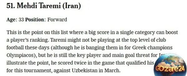 نشریه اتلتیک امروز (چهارشنبه) با تحلیل 1200 بازیکن شرکتکننده در جام جهانی 2026، 100 بازیکن برتر این رقابتها را معرفی کرد. در این لیست، مهدی طارمی، کاپیتان تیم ملی ایران، در رتبه 51 قرار گرفت. طارمی به عنوان یکی از چهار ستاره فوتبال آسیا در میان 100 بازیکن برتر جام جهانی قرار گرفت، و در کنار او دو بازیکن ژاپنی، میتوما و کوبو، و یک بازیکن کرهای، سون، حضور دارند.