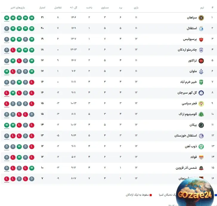 جدول لیگ برتر خلیج فارس هفته دوازدهم: رقابت نزدیک در صدر و بحران در قعر جدول، سپاهان صدرنشین و مس در پایینترین جایگاه