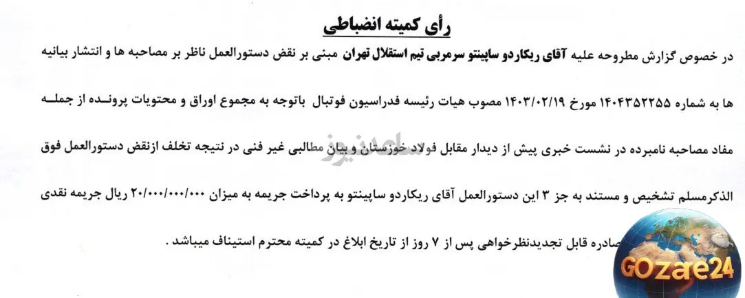 حکم کمیته انضباطی برای ساپینتو: جریمه دو میلیارد تومانی و حذف محرومیت تعلیقی