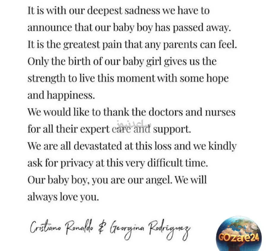 رونالدو در متن خود نوشت: «با کمال تاسف، خبر از فوت فرزندمان دادیم. این بزرگترین دردی بود که هر پدر و مادری میتوانست تجربه کند. تنها تولد دخترمان توانست ما را با امید و شادی در آن زمان همراه کند. از پزشکان و پرستاران بابت مراقبتهایشان سپاسگزاریم. ما در غم و اندوه عمیقی فرو رفته بودیم و در این دوران سخت خواستار حفظ حریم خصوصی بودیم. پسرم، تو فرشتهای برای ما بودی. همیشه تو را در قلبمان خواهیم داشت.»