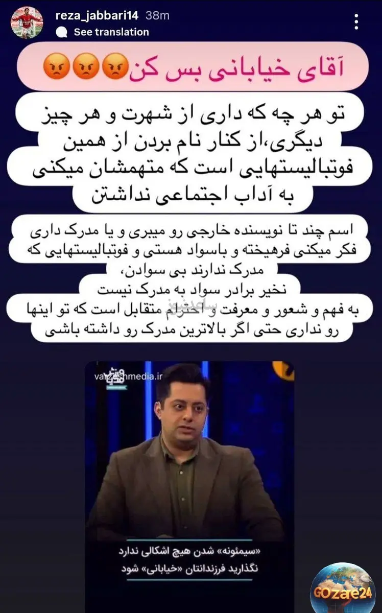رضا جباری به صحبتهای جواد خیابانی درباره رفتارهای اجتماعی و پاکدامنی فوتبالیستها واکنش نشان داد؛ جزئیات در استوری جدید او.