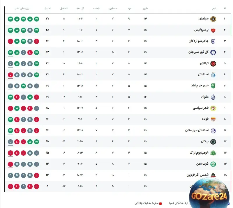 جدول لیگ برتر پس از هفته ۱۵: سپاهان صدرنشین با ۳۰ امتیاز، رقابت نزدیک پرسپولیس و تیمها در پایین جدول نگرانکننده است.